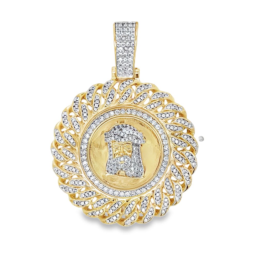 Cuban Gold Jesus Piece Medallion CZ Iced Out Pendant. This hip hop pendant features round cut simulated diamond stones giving this bling bling charm a unique shine and look to it. Beautifully crafted with precision stone setting. Hot style iced out Pendant that is unique and stands out from the crowd. The VVS CZ Simulated Diamonds have a bling bling shine as if they were genuine diamonds.