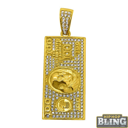 .925 Sterling Silver Gold $100 Bill CZ Hip Hop Pendant