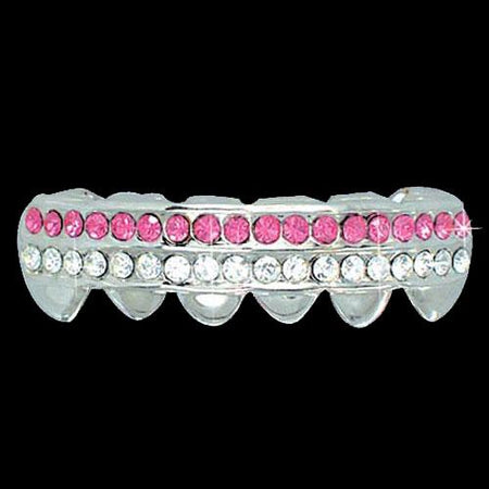PINK / CLEAR Double Bar SILVER Iced Out Grillz Hip Hop Bling Grills BOTTOM